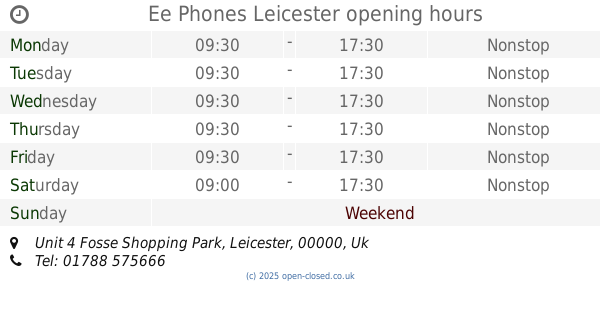 It is also possible to : Edit these OPENING HOURS of Store Ee Phones In Leicester, Unit 4 Fosse Shopping Park,